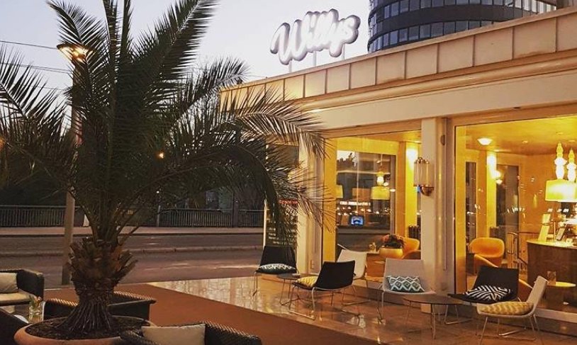 Alte Tischgestelle wurden aufgearbeitet und der alte Garderobenständer – jetzt vergoldet – fand seinen neuen Platz. Blickfang beim Betreten des Willys ist die Bar und die kleine Lounge zur Straße. Die Theke, in expressivem Design mit indirekter Beleuchtung und mit darüber hängenden individuellen Leuchten aus einer italienischen Manufaktur unterstreichen die Einzigartigkeit des Konzepts.