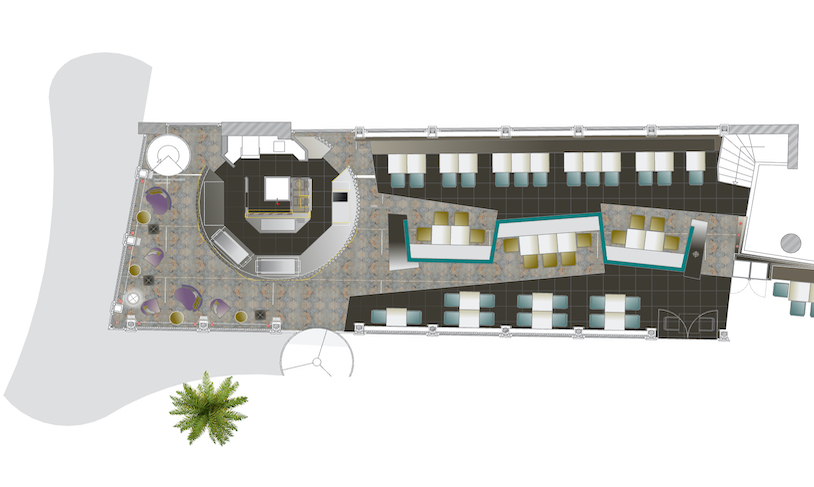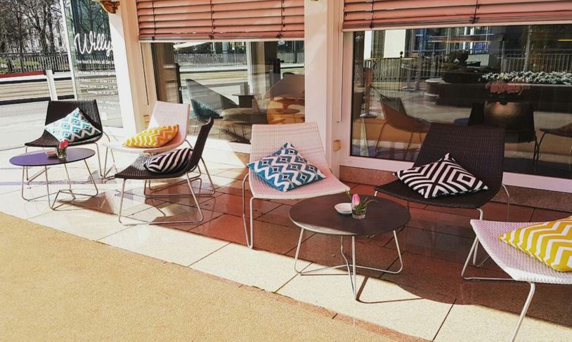 „Es soll weder Bistro, Bar, Café oder Restaurant sein, es ist ganz einfach das Willys.“ Der Raum – in lässiger Eleganz mit progressiven und individuellen Materialien geschaffen – ist dreigegliedert: auf der einen Seite eine lange Sitzbank, Tische und bequeme Sessel, auf der anderen Seite Tische mit Stühlen. Dazwischen sind geschickt mehrere Sitznischen geschaffen worden, die mit ihren hohen Lehnen einen geschwungenen Raumteiler bilden und kleine Gruppen dezent abschirmen. Altes wurde übernommen und neu interpretiert: