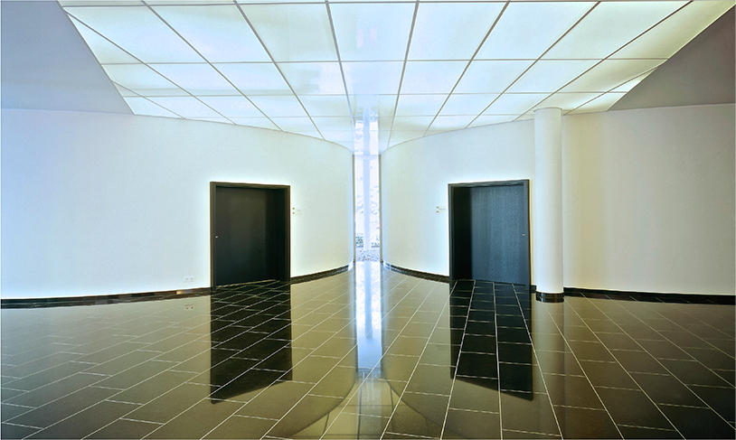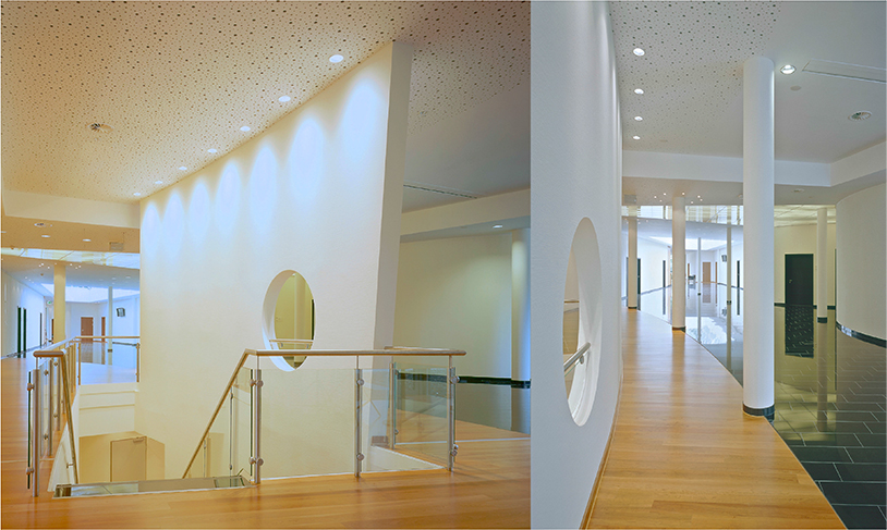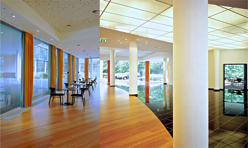 Cherry hardwood and black granite make an interesting contrast. Thus the high number of pillars in this row could be integrated aesthetically. In the back of the lobby the low ceiling visually heightened by indirect lights. These illuminated ceilings connect the two round seminar rooms and automatically lead the students into the communication and recreation areas.