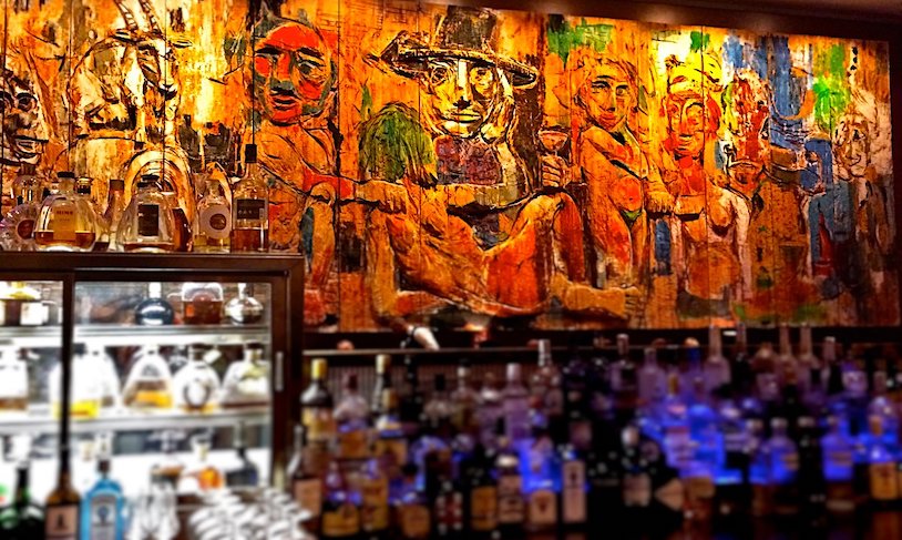 In the restaurant itself one finds the world’s largest wood relief, the “Bacchanal” by artist Jean-Yves Klein. The restaurant’s arrangement combines a stylish atmosphere with a modern flair. In addition, the dark wooden tables and corresponding dark-brown leather chairs are emphasized with colorful features on the wall in pink and orange. Importance was placed on indirect and pleasant lighting.